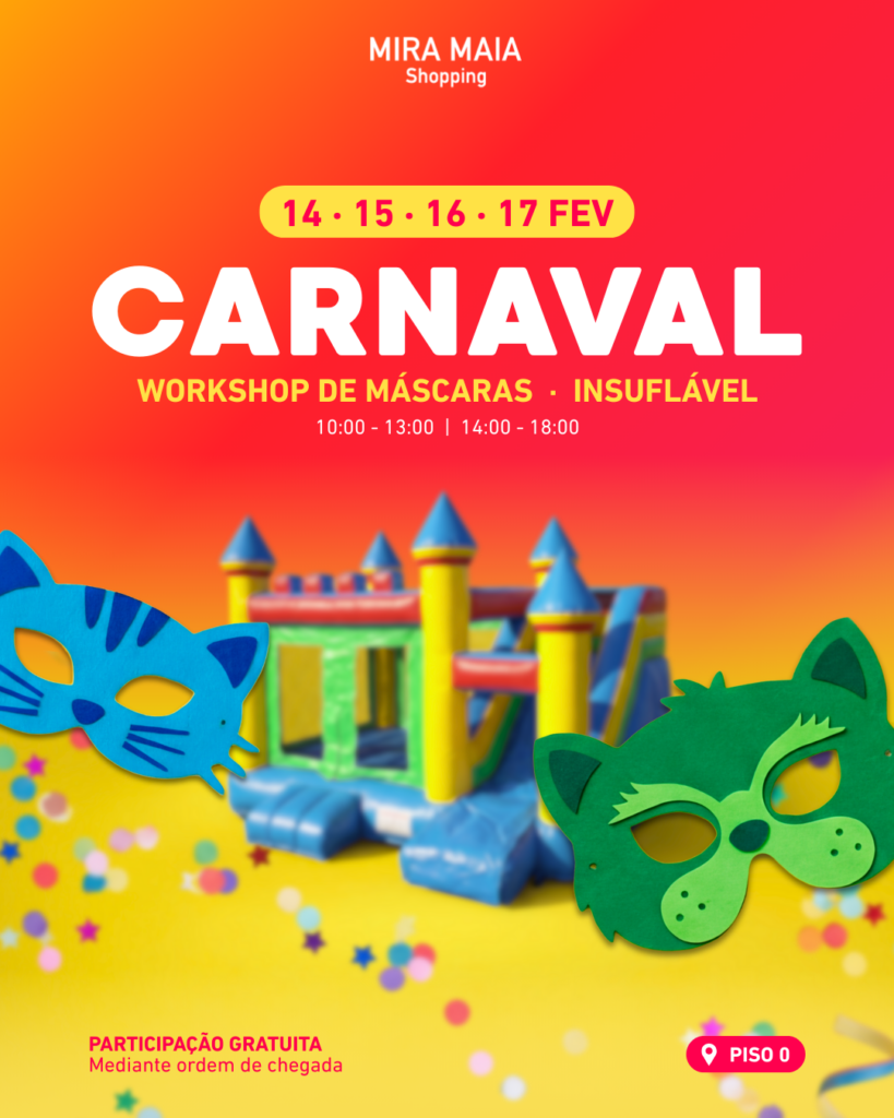 Neste Carnaval, o Mira Maia Shopping convida os mais pequenos a viver dias cheios de cor e diversão com um workshop criativo e um insuflável preparados para animar.